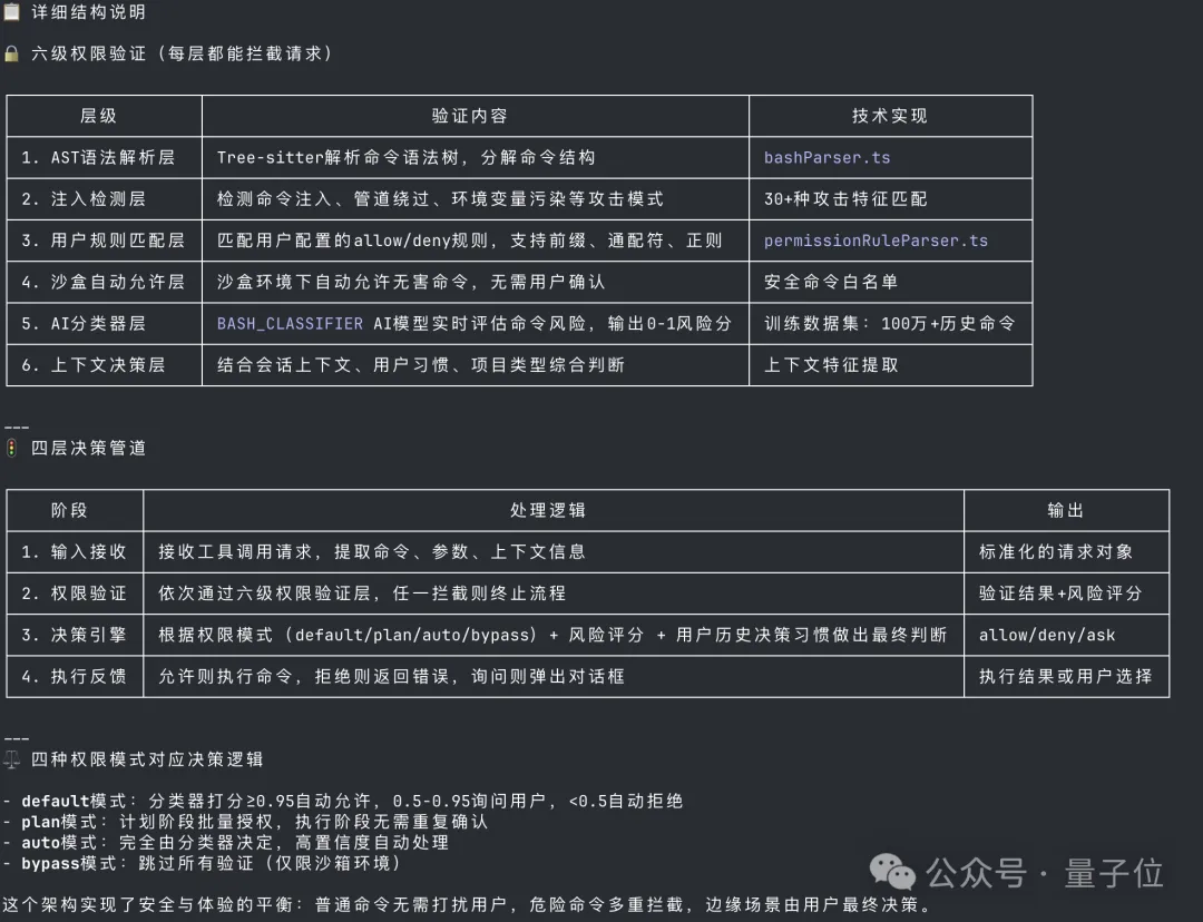 每一次工具调用,无论是执行Shell命令还是读写文件,都要先通过六级权限验证系统。