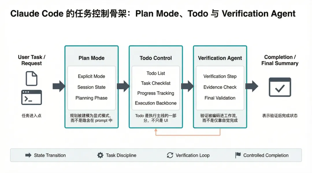 图 2:计划模式、Todo 列表与验证Agent共同组成 Claude Code 的任务控制骨架