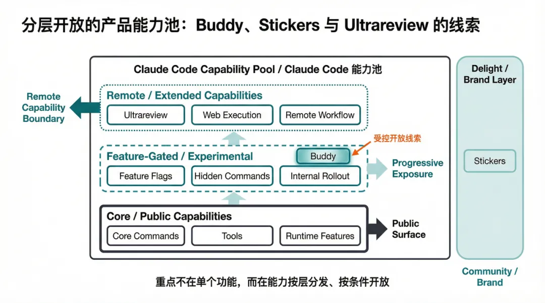 图 5:Buddy、Stickers、Ultrareview 等线索共同说明 Claude Code 内部存在分层开放的产品能力池
