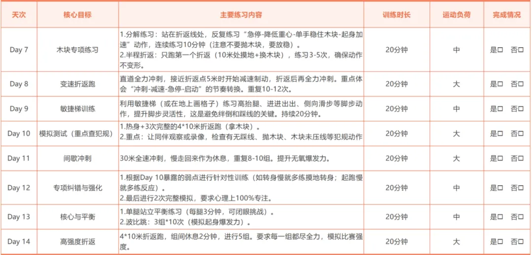 ▶训练内容:“急停-降低重心-单手稳住木块-起身加速”动作、模拟比赛训练等内容,具体训练安排可参考下图↓