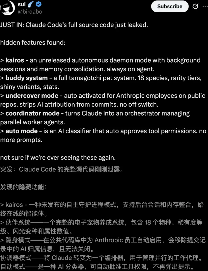 警惕“卧底模式”:代码中还有一个“Undercover Mode”,能强行抹除AI痕迹。这提醒我们:在享受AI红利时,也要思考人机协作的边界与透明性。