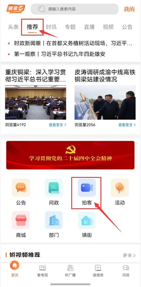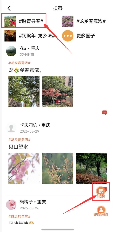 打开“铜梁”APP,进入“拍客”页面,页面上方显示了可以参与的话题活动,点击进入“踏青寻春”,再进行发帖即可。(PS:必须要参与话题活动才可以参与评奖哦!)