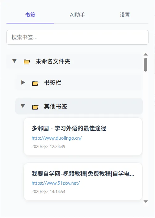 1. 扩展面板:点击工具栏图标,切换「书签/AI助手/设置」,管理+搜索一站式完成; -