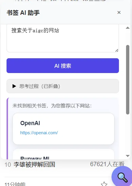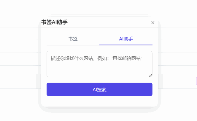 1. 双模式搜索传统搜索:快速匹配书签标题、URL,精准定位已存书签;AI智能搜索:自然语言描述需求,AI自动匹配关联书签,摆脱关键词局限。 -