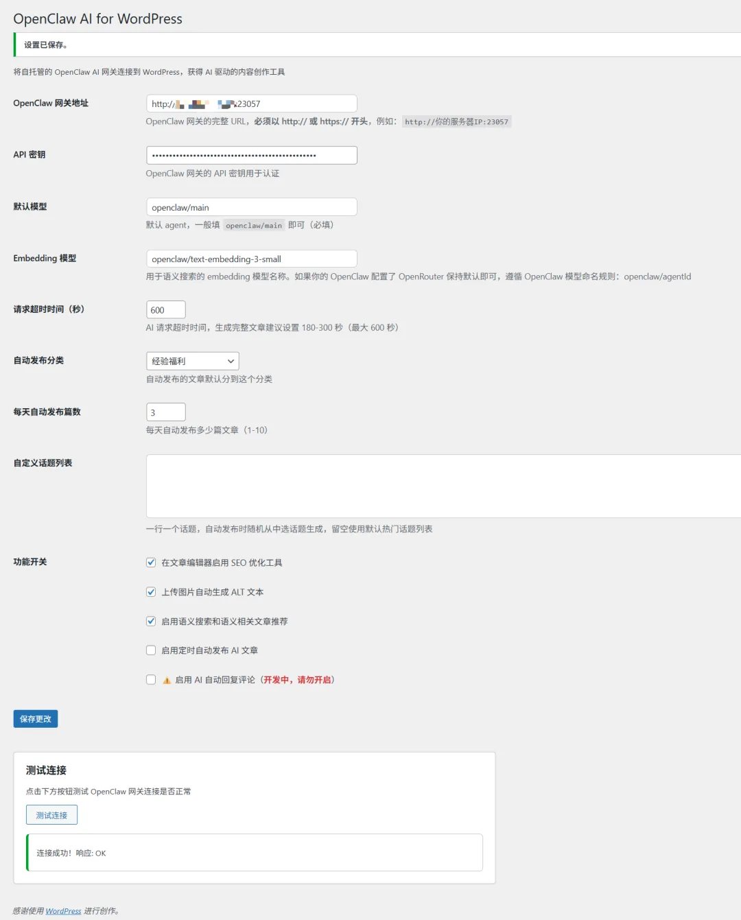 手动测试:登录管理员后台访问 https://你的站点/?openclaw-trigger-auto 即可手动触发一次