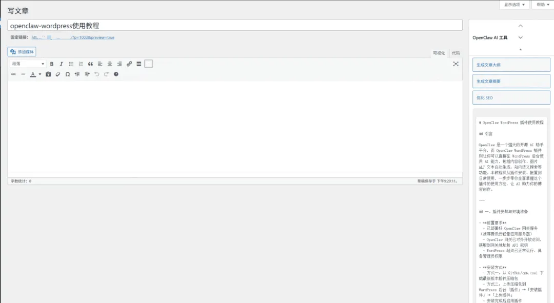 配置成功后,进入文章编辑页面,右侧边栏会显示「OpenClaw AI 工具」面板。