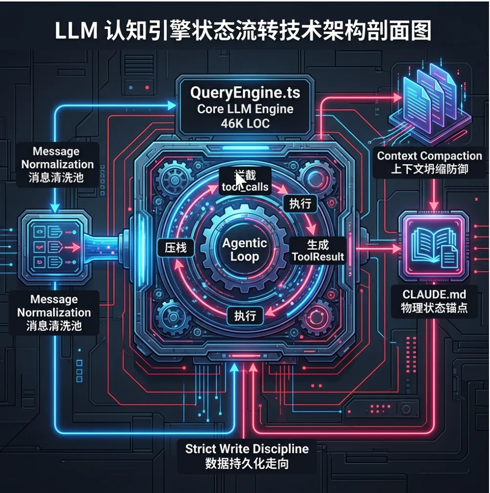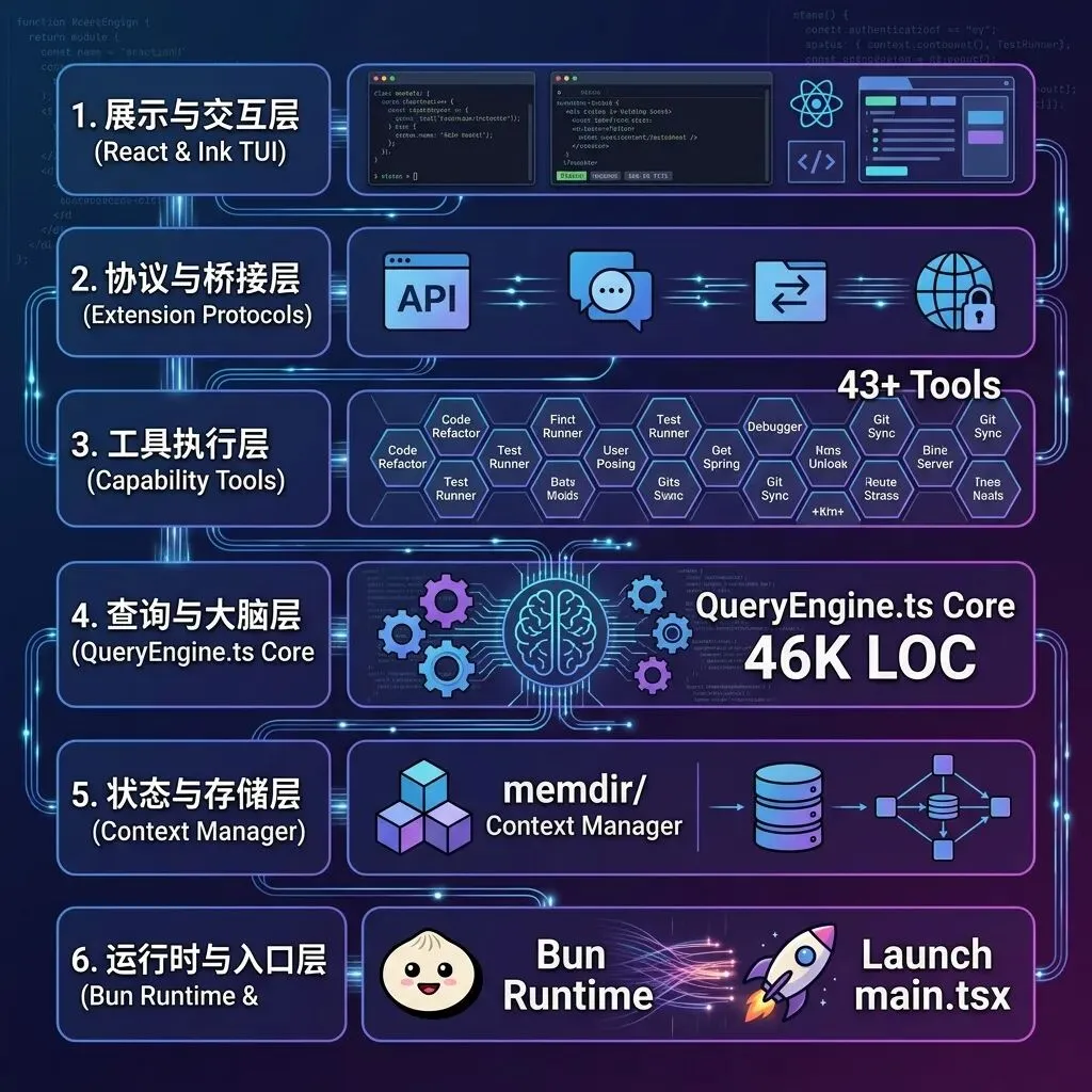 如果你问 Claude Code 最值钱的代码在哪里?一定是那份长达 46,000 行的 src/QueryEngine.ts。它是整套自动化系统的跳动心脏,接管了流式响应拼接、长短期记忆流转以及最核心的工具调用环(Tool Calling Loop)。