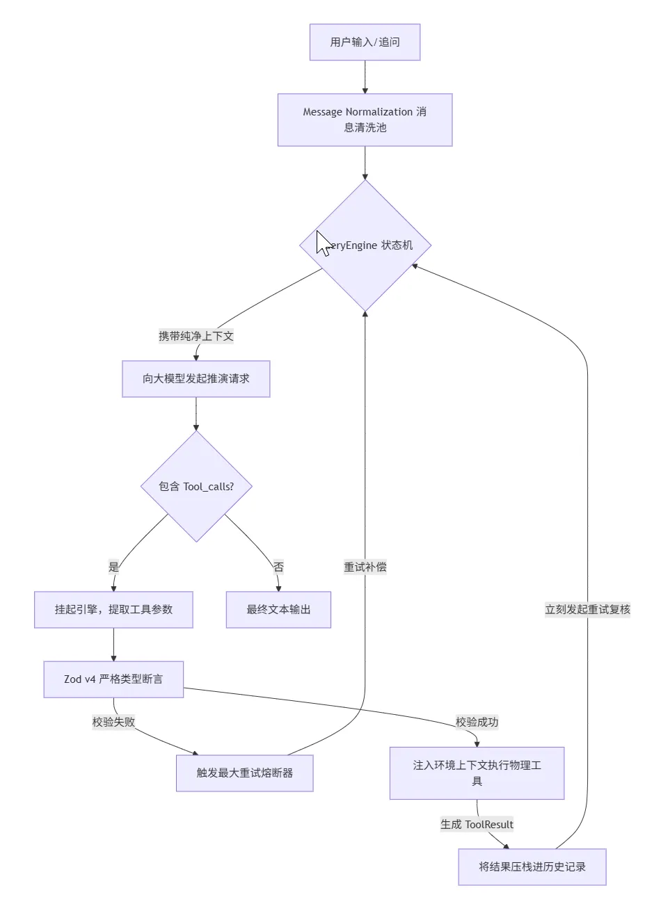 引擎并非一次性请求和简单的响应拦截。下面这个流程图展示了 QueryEngine 毫秒级闭环决策的流转过程