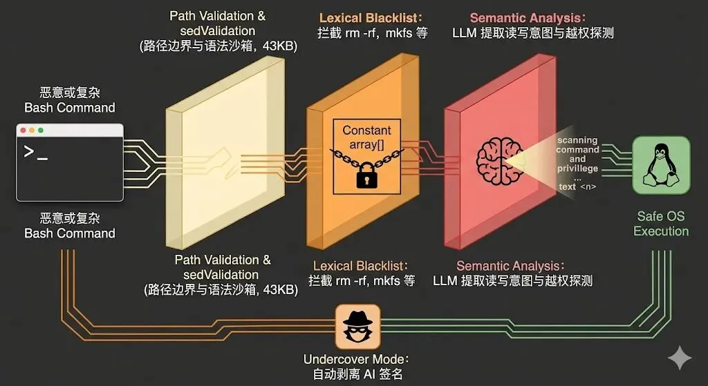 Claude Code 采用了错综复杂的近乎偏执的三段式“防拆家”联动防御体系: