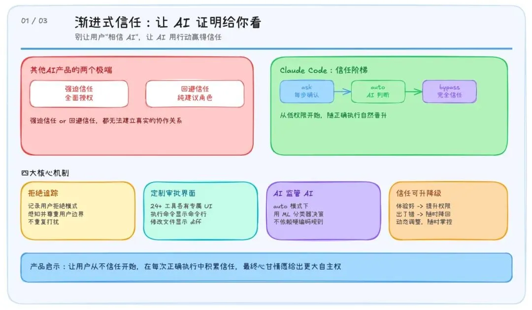 而这只是 Claude Code 整套“渐进式信任”设计的冰山一角。