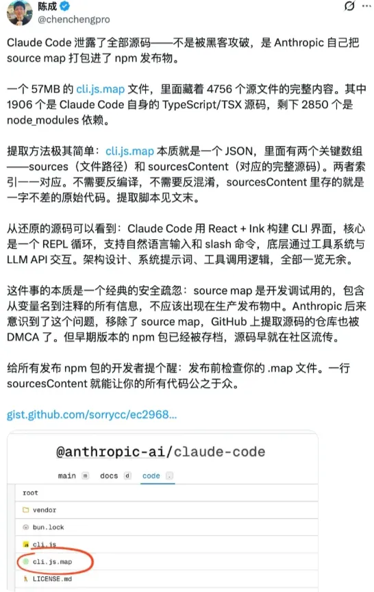 愚人节来到的前一天,AI 圈先炸出一个大瓜 ——Anthropic 旗下最强编程 Agent Claude Code,完整源码又双叒叕泄露了,这次不是黑客攻击,不是被破解,而是公司自己犯了个低级到离谱的错误:发布 npm 包时,忘了删掉开发用的 Source Map 文件!