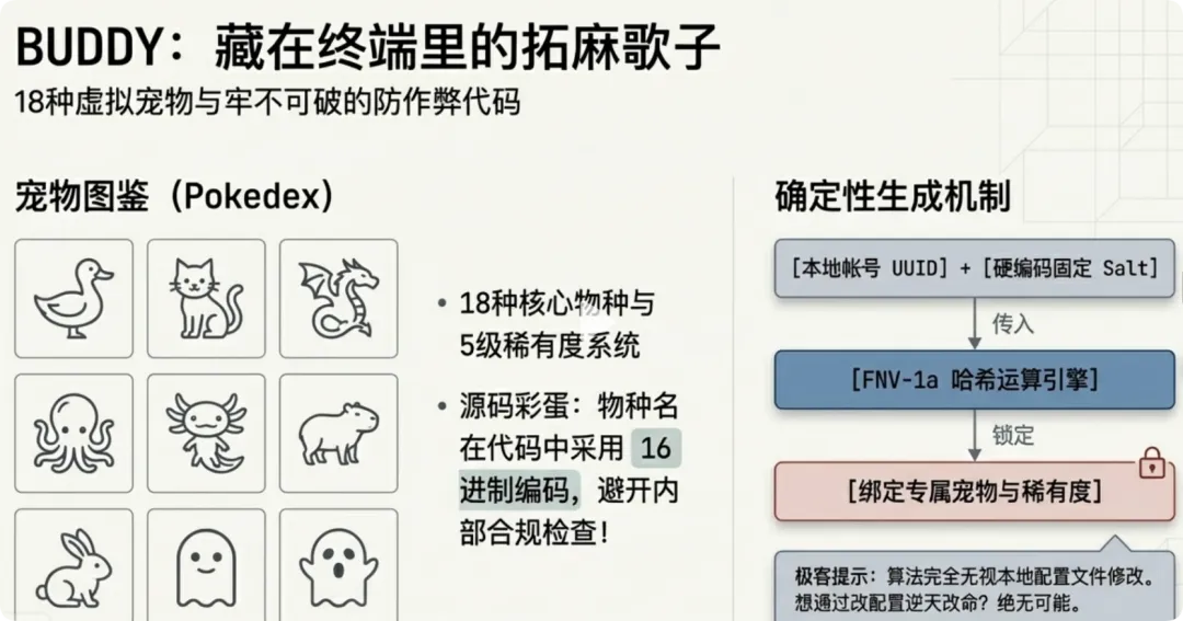 终端虚拟宠物系统,含 18 种物种(鸭子、鹅、猫、龙、章鱼、猫头鹰、企鹅、水豚、胖猫等),5 级稀有度(普通到传说,最稀有概率 1%),1% 闪光概率(类似宝可梦)。宠物生成基于用户账号 UUID + 固定盐值哈希计算,结果唯一且无法通过配置文件修改。物种名采用十六进制编码(如),因部分物种名与内部模型代号冲突,需绕过构建检查。