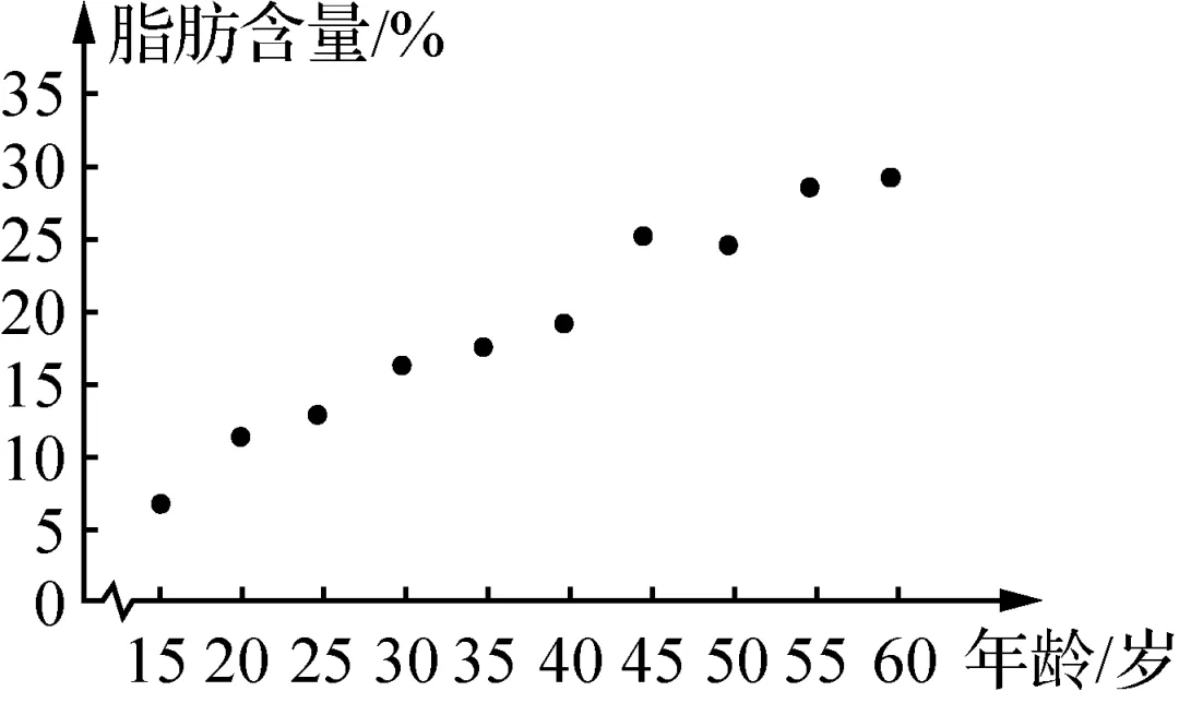 【解析】 观察图形,可知人体脂肪含量与年龄正相关,且脂肪含量的中位数小于20%.