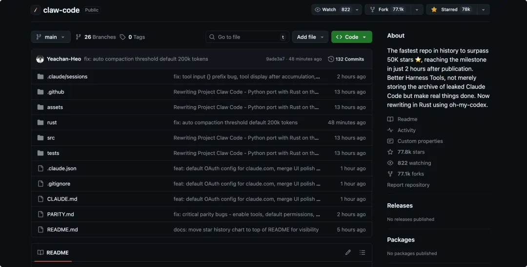 昨天 Claude Code 源码泄露的事大家应该都已经知道,源码公开十多个小时,已经有了 78k 的 star 和 77.1k 的 Fork,堪称历史上 star 增长最快的项目之一了