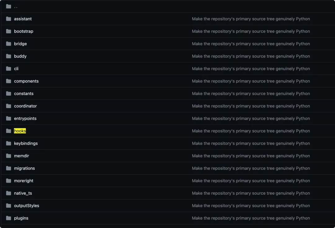 你会看到它不只是 cli、assistant、tools 这种基础目录,还出现了 hooks、skills、plugins,甚至还有 buddy(在这里可以理解为宠物伴侣。和最后的隐藏功能有关系)。