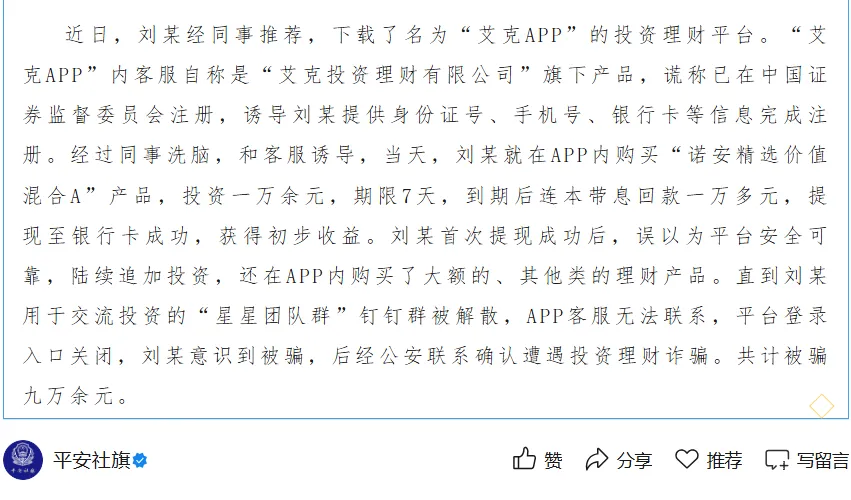 投资理财陷阱层出不穷,一款名为“艾克APP”的平台近期在多地引发大量受骗案例,不少普通人抱着赚钱的想法入场,最终却落得血本无归。结合社旗县公安局官方反诈通报与真实受害者经历,今天把这起骗局的完整套路、平台最新现状告诉大家,希望每一位看到的人都能提高警惕,也及时转发给身边正在接触理财、投资的亲友,从源头避开陷阱。