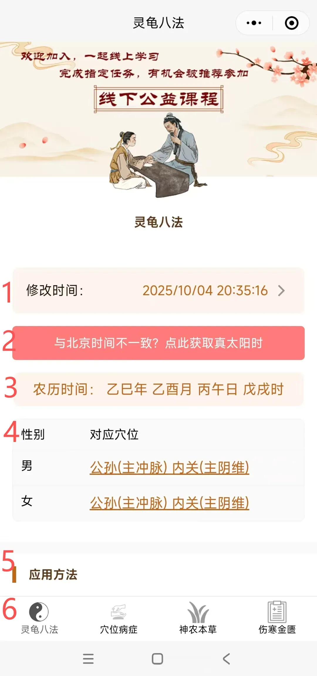 打开人纪助手之后,默认进来的是灵龟八法页面,此页面默认加载当前北京时间(图中1)气血流注的穴位(图中4),也可以点击时间(图中1)修改查看之前或者之后的气血流注穴位。