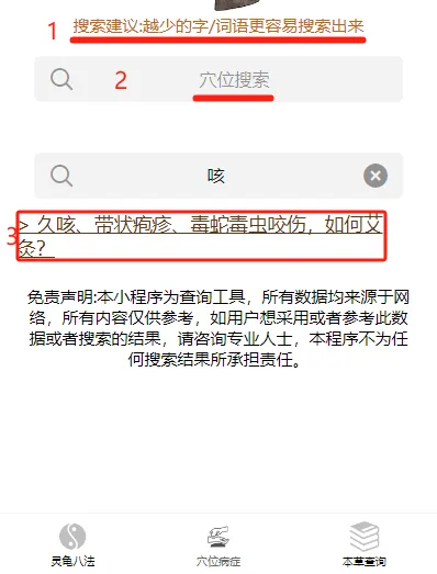 点击穴位病症,可切换至穴位和病症搜索页面,输入框有提示(图中2所示):穴位搜索还是病症搜索。