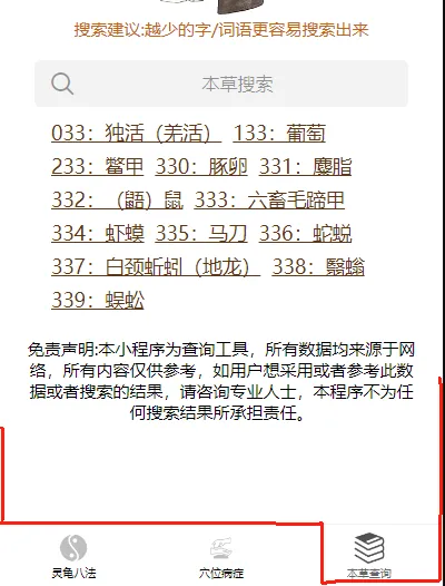 本小程序所有搜索结果仅供广大中医爱好者学员学习之用,不作为专业的诊疗意见和依据。如果您及亲友有身体不适或有疑问,建议咨询具有专业资质的人士或到医院就医。请勿随意使用搜索结果用于诊疗;如因您擅自使用的,一切结果和责任由您自己承担,与本小程序的发布者和开发者无关。