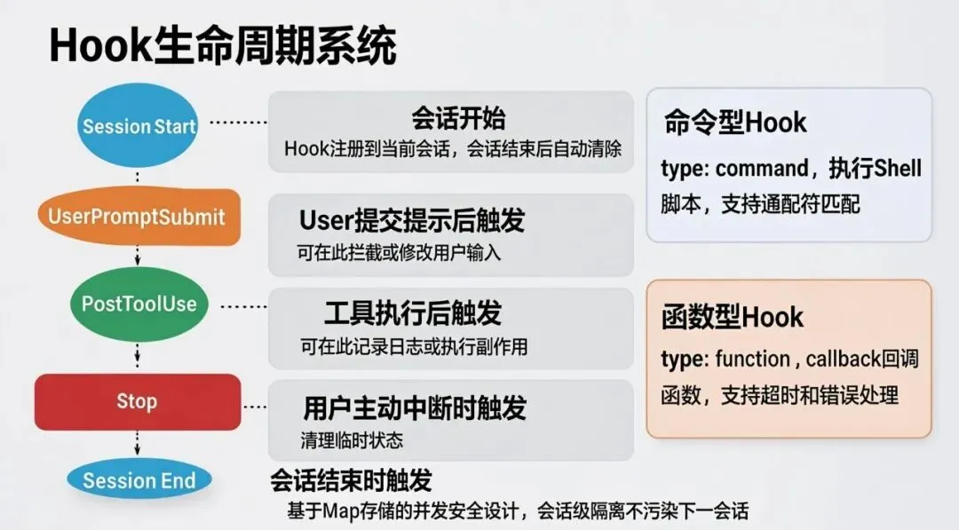 :Hook 是会话级别的,会话结束自动清除,不会污染下一个会话 - 并发安全