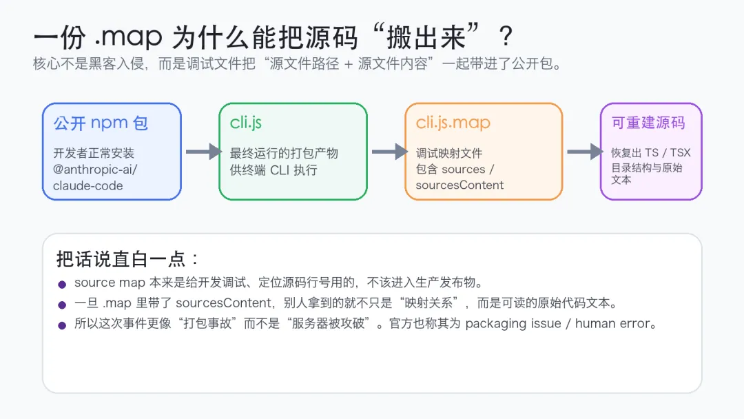 公开讨论和媒体报道普遍指向:Anthropic 在一次 npm 发布中,把 source map 文件 一起发了出去。