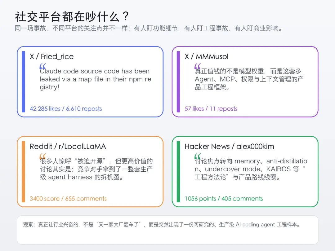 X 上最早把这件事点爆的,是 Chaofan Shou(@Fried_rice)。随后 GitHub 镜像、Reddit 讨论、Hacker News 拆解,在几个小时内迅速扩散。