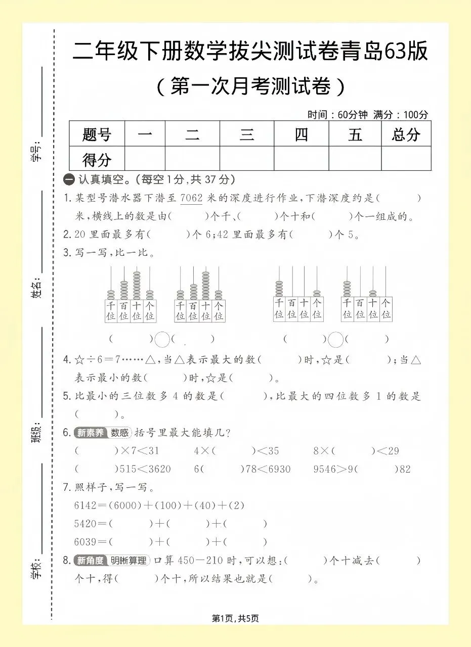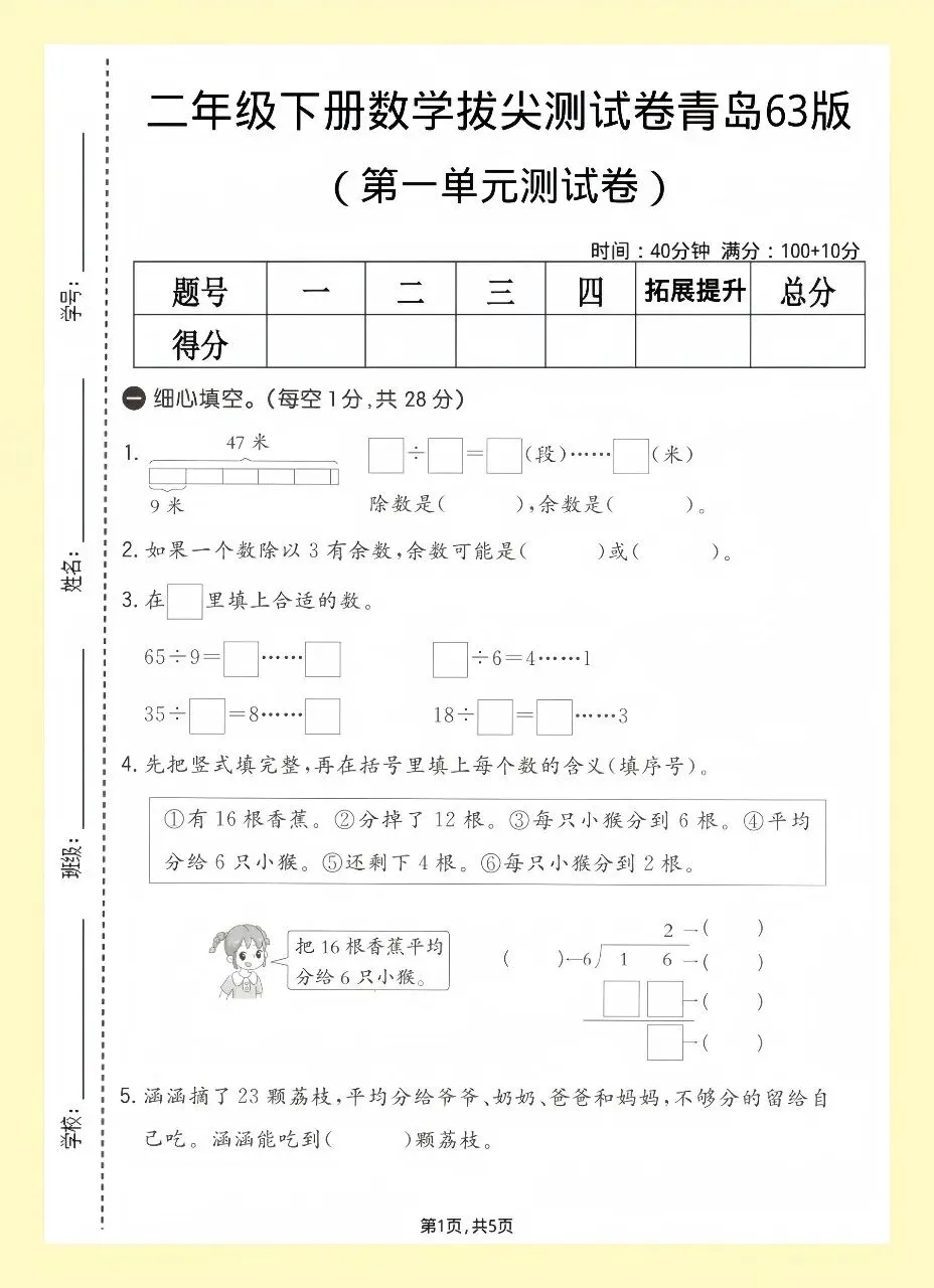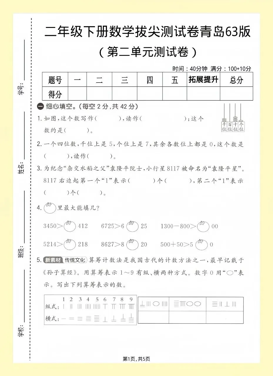 二年级数学拔尖单元测试卷|高清可打印有答案