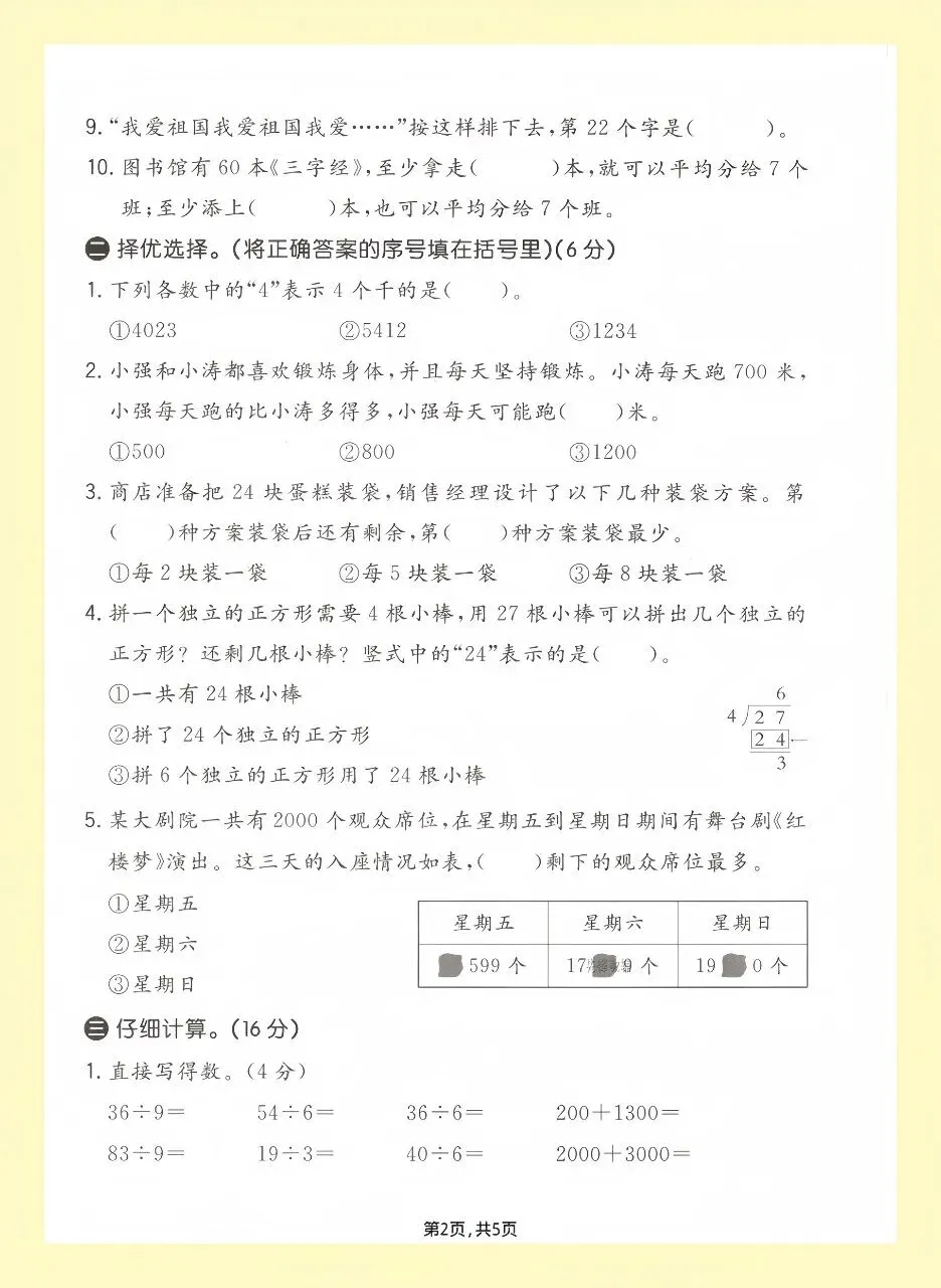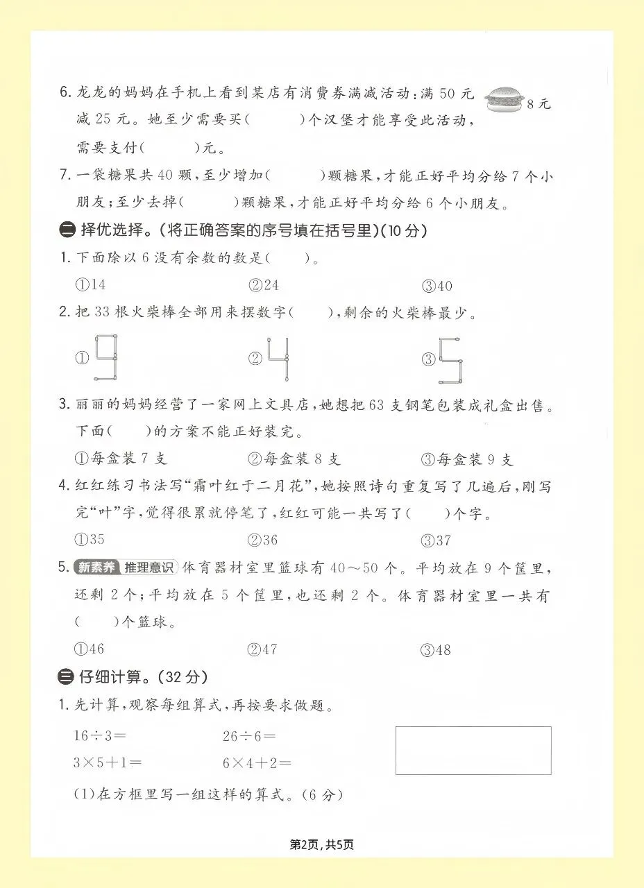 包含口算、填空、选择、比大小、简单应用题