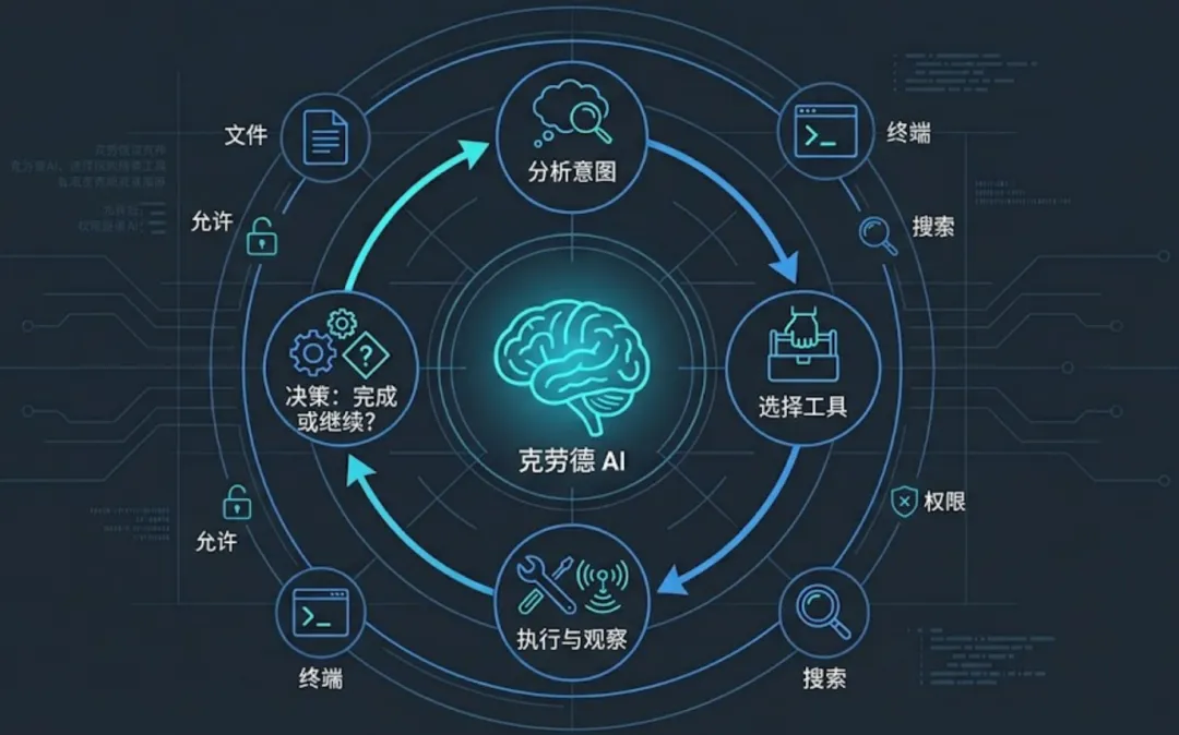 async function agentLoop(userMessage: string, context: ConversationContext) {context.messages.push({ role: "user", content: userMessage });while(true) {const response = await callClaudeAPI({messages: context.messages,tools: getAvailableTools(),system: buildSystemPrompt(context),});// 纯文本回复 → 任务完成,退出循环if(response.stopReason === "end_turn") {return response.content;}// AI 请求调用工具 → 执行后继续循环if(response.stopReason === "tool_use") {for(const toolCall of response.toolCalls) {const result = await executeToolWithPermissionCheck(toolCall);context.messages.push({ role: "tool", toolUseId: toolCall.id, content: result });}continue; // 关键:不 return,让 AI 基于工具结果继续推理}}}