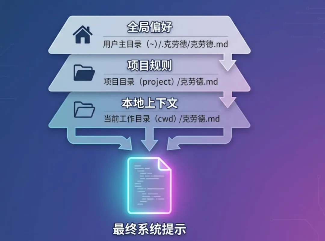 其中最精妙的是CLAUDE.md 的三级加载机制: