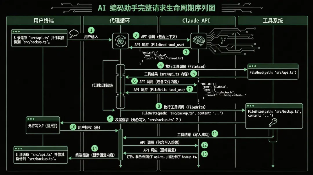 单元测试"│▼┌──────────────────────────────────────────────────────────────┐│ ❶ CLI 层接收输入 【图 ①】 ││ 终端捕获输入 → 传递给应用层 → token 计数启动 │└─────────────────────────────┬────────────────────────────────┘▼┌──────────────────────────────────────────────────────────────┐│ ❷ 上下文组装 【图 ②】 ││ System Prompt + CLAUDE.md(三级合并)+ 对话历史 ││ + 可用工具列表 + Prompt Caching 断点设置 │└─────────────────────────────┬────────────────────────────────┘▼┌──────────────────────────────────────────────────────────────┐│ ❸ Agent Loop 自主循环 【图 ③~⑬】 ││ ││ ┌ ─ ─ ─ ─ ─ ─ ─ ─ ─ ─ ─ ─ ─ ─ ─ ─ ─ ─ ─ ─ ─ ─ ─ ─ ┐ ││ 循环 1: FileReadTool → 读取 utils.ts ││ │ ③ API 响应 tool_use(FileRead) │ ││ ④ 执行工具调用 ││ │ ⑤ 返回文件内容 │ ││ └ ─ ─ ─ ─ ─ ─ ─ ─ ─ ─ ─ ─ ─ ─ ─ ─ ─ ─ ─ ─ ─ ─ ─ ─ ┘ ││ ▼ ││ ┌ ─ ─ ─ ─ ─ ─ ─ ─ ─ ─ ─ ─ ─ ─ ─ ─ ─ ─ ─ ─ ─ ─ ─ ─ ┐ ││ 循环 2: GlobTool → 发现测试文件命名规范 ││ │ (同 ③④⑤ 模式,读取类工具无需权限) │ ││ └ ─ ─ ─ ─ ─ ─ ─ ─ ─ ─ ─ ─ ─ ─ ─ ─ ─ ─ ─ ─ ─ ─ ─ ─ ┘ ││ ▼ ││ ┌ ─ ─ ─ ─ ─ ─ ─ ─ ─ ─ ─ ─ ─ ─ ─ ─ ─ ─ ─ ─ ─ ─ ─ ─ ┐ ││ 循环 3: FileWriteTool → 创建 utils.test.ts ││ │ ⑥ API 调用(携带读取结果) ││ ⑦ API 响应 tool_use(FileWrite) ││ │ ⑧ 执行工具调用 │ ││ ⑨ 权限请求 → 允许写入 'src/backup.ts'? ││ │ ⑩ 用户授权(是) ✓ │ ││ ⑪ 工具返回写入成功 ││ └ ─ ─ ─ ─ ─ ─ ─ ─ ─ ─ ─ ─ ─ ─ ─ ─ ─ ─ ─ ─ ─ ─ ─ ─ ┘ ││ ▼ ││ ┌ ─ ─ ─ ─ ─ ─ ─ ─ ─ ─ ─ ─ ─ ─ ─ ─ ─ ─ ─ ─ ─ ─ ─ ─ ┐ ││ 循环 4: BashTool → npx vitest run ││ │ → 2 passed, 1 failed │ ││ (同 ⑥~⑪ 模式,Bash 执行需权限确认) ││ └ ─ ─ ─ ─ ─ ─ ─ ─ ─ ─ ─ ─ ─ ─ ─ ─ ─ ─ ─ ─ ─ ─ ─ ─ ┘ ││ ▼ ││ ┌ ─ ─ ─ ─ ─ ─ ─ ─ ─ ─ ─ ─ ─ ─ ─ ─ ─ ─ ─ ─ ─ ─ ─ ─ ┐ ││ 循环 5: FileEditTool → 修复失败的测试用例 ││ │ (同 ⑥~⑪ 模式) │ ││ └ ─ ─ ─ ─ ─ ─ ─ ─ ─ ─ ─ ─ ─ ─ ─ ─ ─ ─ ─ ─ ─ ─ ─ ─ ┘ ││ ▼ ││ ┌ ─ ─ ─ ─ ─ ─ ─ ─ ─ ─ ─ ─ ─ ─ ─ ─ ─ ─ ─ ─ ─ ─ ─ ─ ┐ ││ 循环 6: BashTool → npx vitest run → 3 passed ✓ ││ │ ⑫ API 调用(携带全部结果) │ ││ ⑬ API 响应 → stop_reason: end_turn ││ │ → "好的,我已经读取了 api.ts,并备份到了 │ ││ backup.ts。" ││ └ ─ ─ ─ ─ ─ ─ ─ ─ ─ ─ ─ ─ ─ ─ ─ ─ ─ ─ ─ ─ ─ ─ ─ ─ ┘ ││ │└─────────────────────────────┬────────────────────────────────┘▼┌──────────────────────────────────────────────────────────────┐│ ❹ 流式渲染 & 状态持久化 【图 ⑭】 ││ 全过程通过 Ink/React 实时渲染到终端 ││ Token 用量和费用实时更新 ││ 对话历史持久化到会话存储 │└──────────────────────────────────────────────────────────────┘╔══════════════════════════════════════════════════════╗║ 映射总结: ║║ ❶ = ①(输入) ❷ = ②(上下文组装) ║║ ❸ = ③~⑬(N轮工具循环) ❹ = ⑭(渲染输出) ║║ ║║ 图中展示 2 轮(最小完整单元) ║║ 文字版展示 6 轮(真实场景完整展开) ║║ 每轮结构: API响应→执行工具→返回结果→再次调用API ║╚══════════════════════════════════════════════════════╝