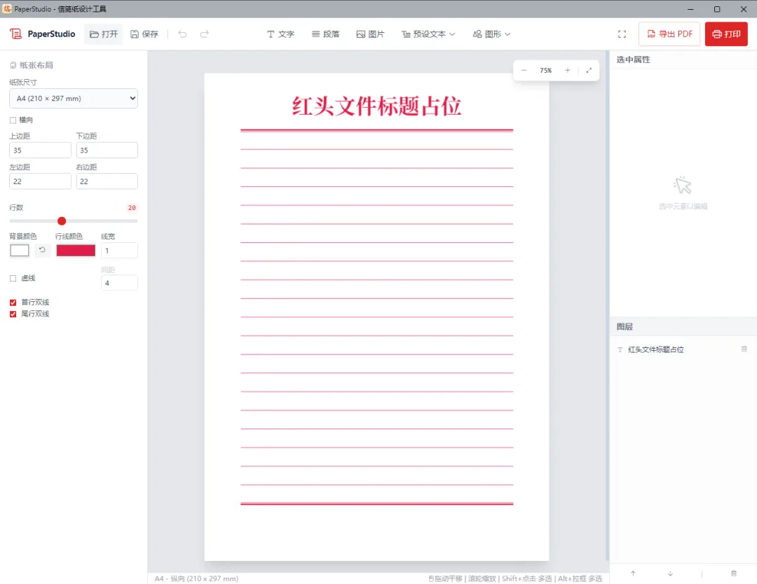 无论是公文、报告、手写信件,还是创意排版,PaperStudio 都能帮你轻松打造高度定制化、专业级信笺纸模板。无需设计基础,拖拽式操作 + 参数化调节,让你在几分钟内设计出媲美印刷品的精美纸张。