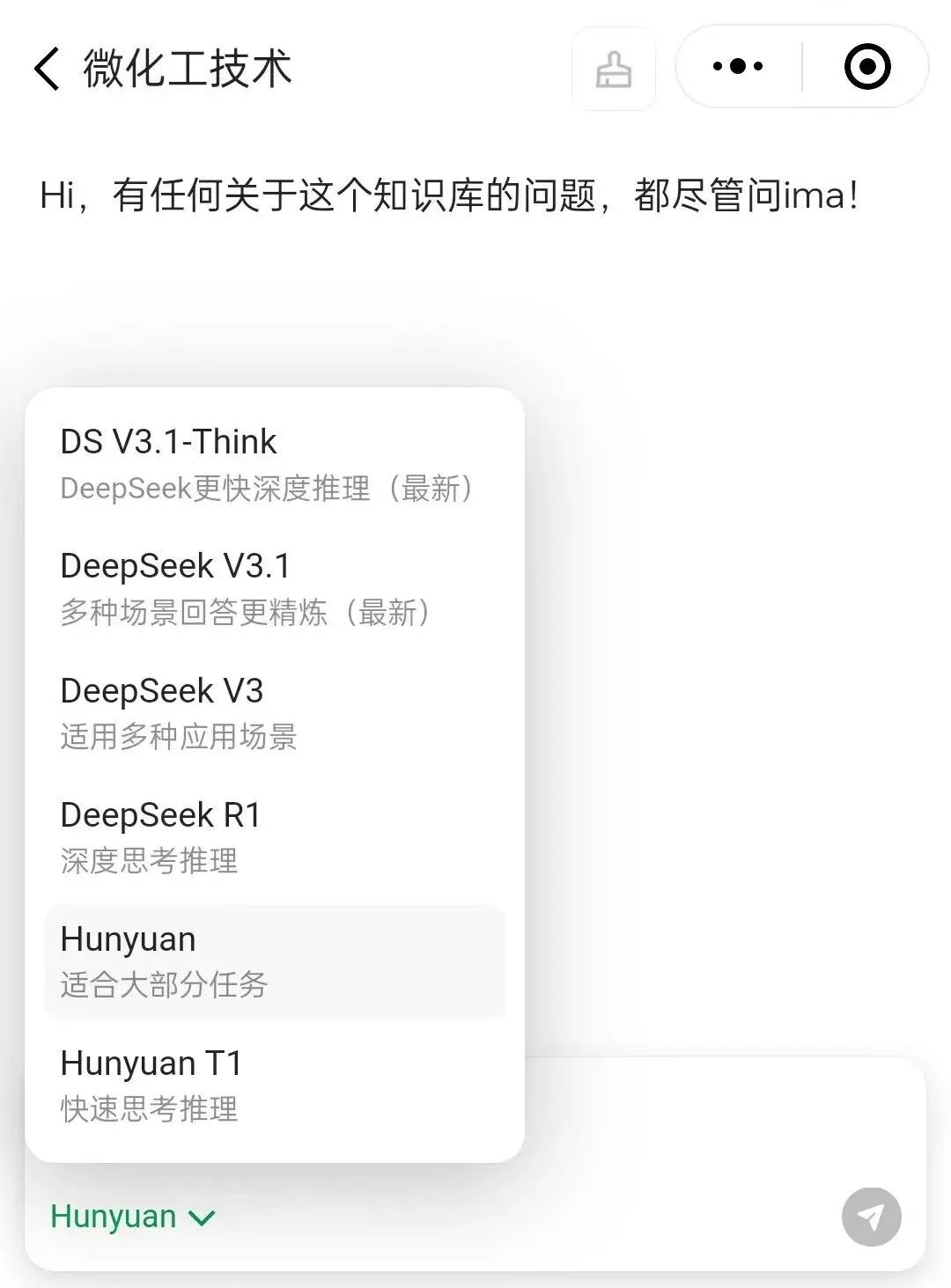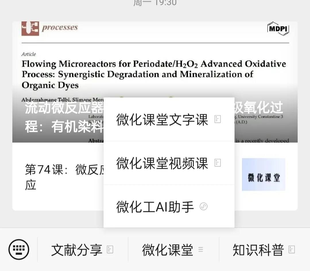 (1)在微信公众号的消息界面,点击《微化课堂》栏目,选择《微化工AI助手》,点击进入: