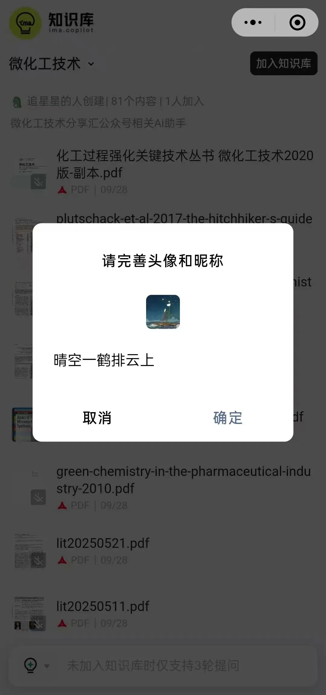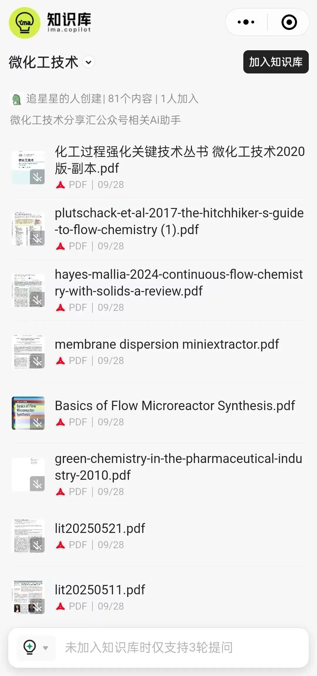 (2)点击《微化工AI助手》栏目后,跳转到如下小程序界面,已经将公众号所涉及的文献全部导入数据库,后续会继续更新。初次登录时,需要先点击界面右上角《加入知识库》进行知识库的注册加入,就可以基于知识库内的文献进行多次提问,如果不选择加入知识库,则仅支持3次提问。