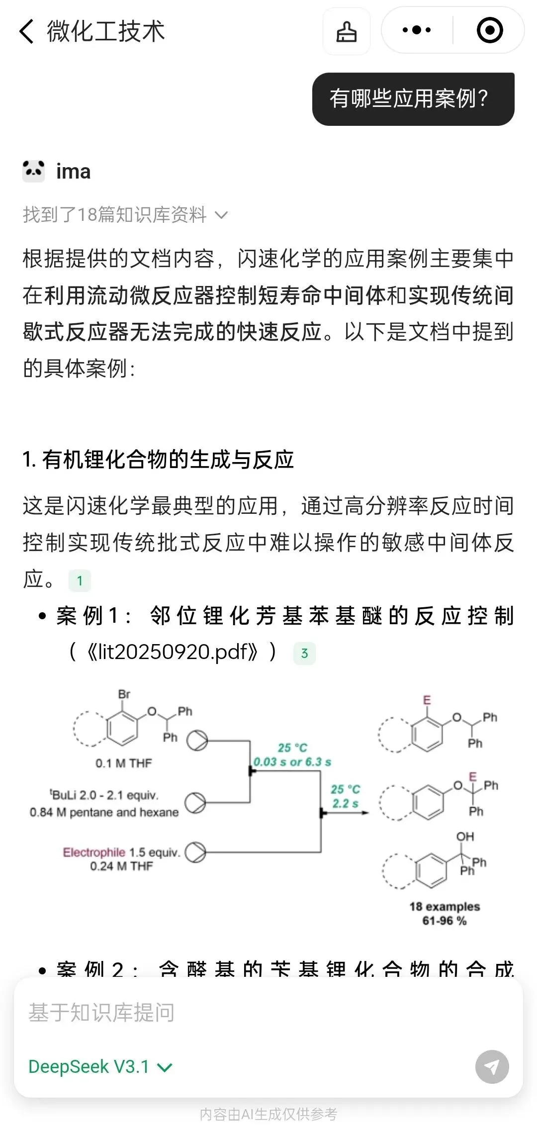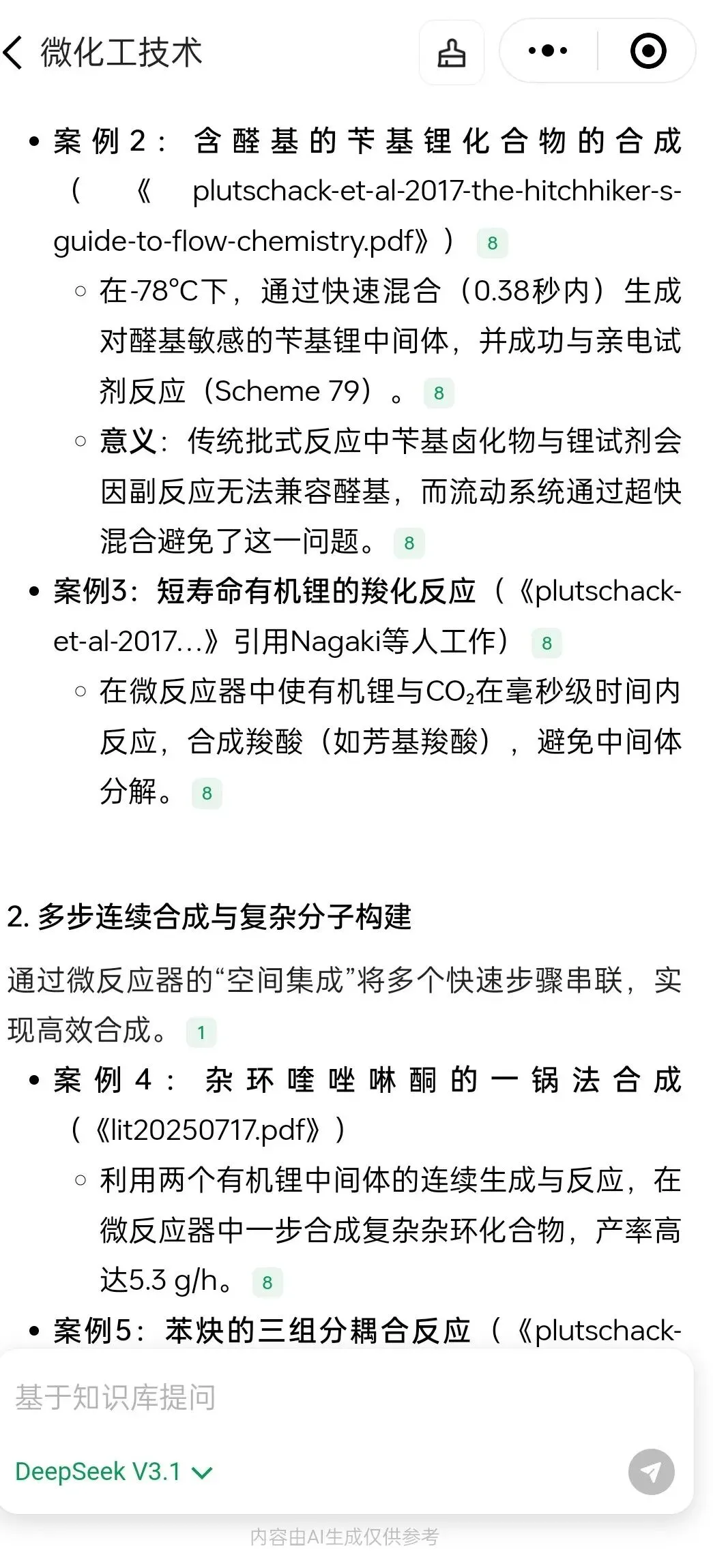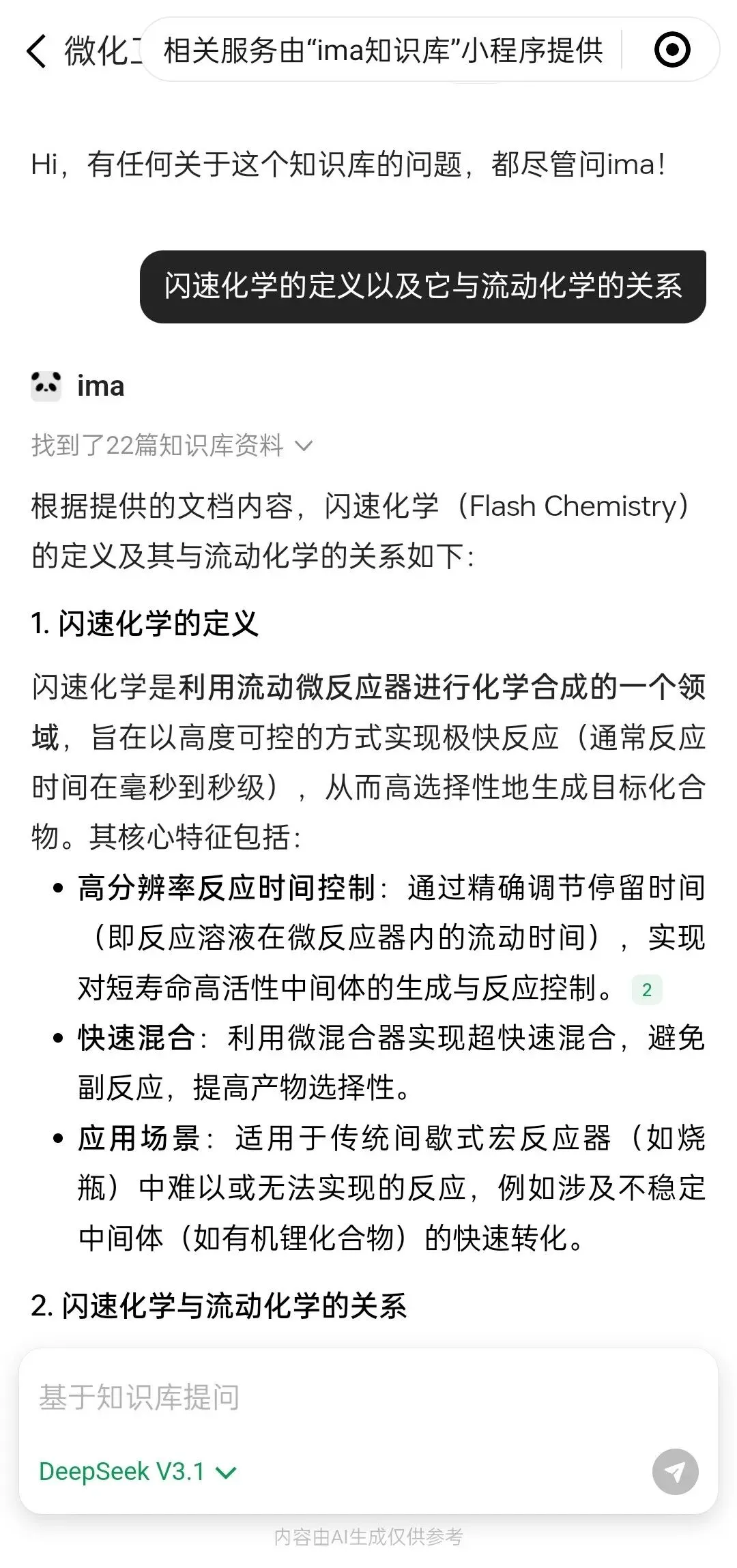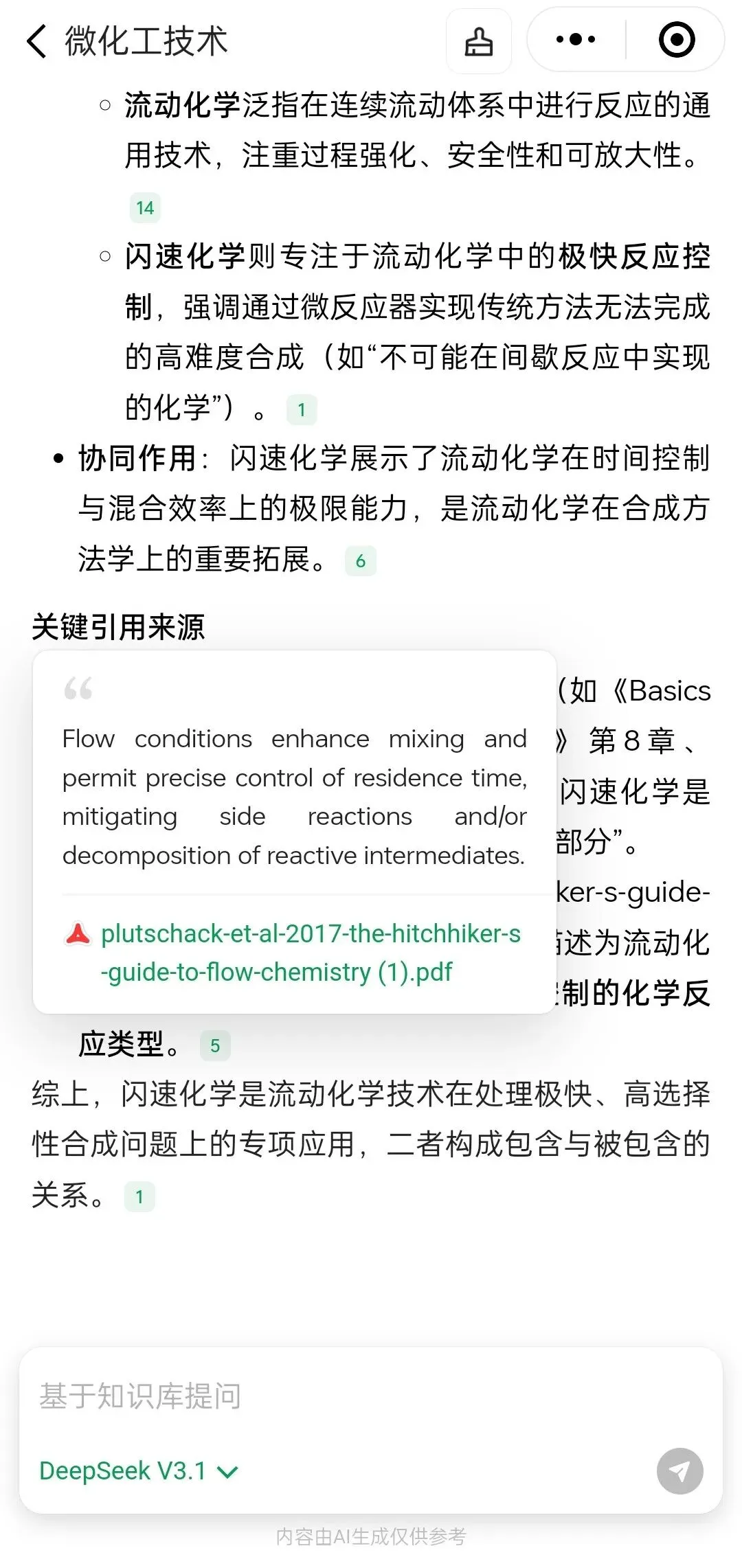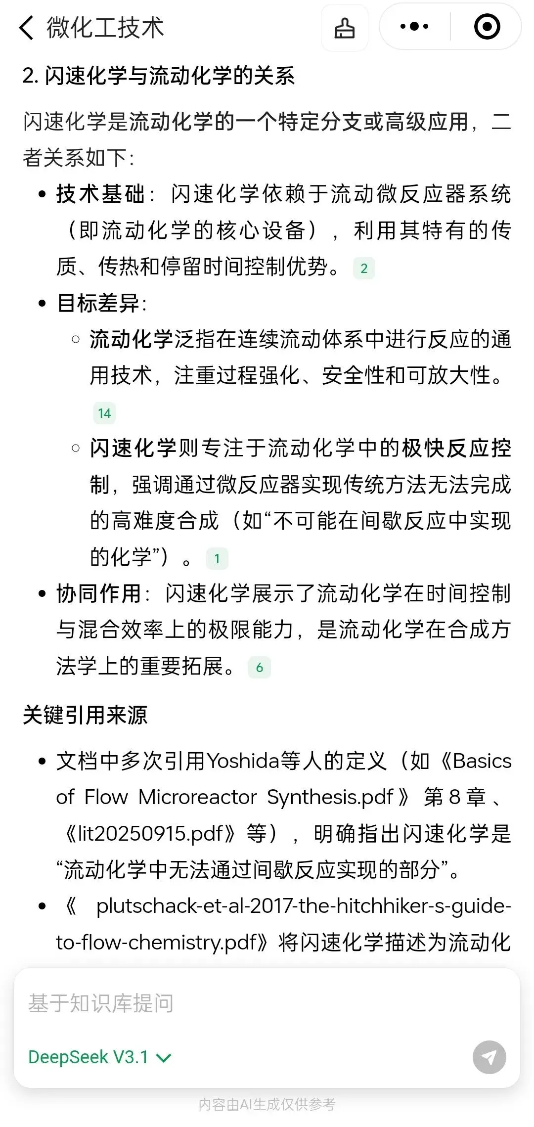 (5)如下例所示,选择DeepSeek V3.1模型后进行提问,问题为《闪速化学的定义及与流动化学的关系》,所得到的回答如下图所示,大模型参考了数据库内22篇文献进行问题推理,得到相关的答案,并且每部分回答都标记了参考文献: