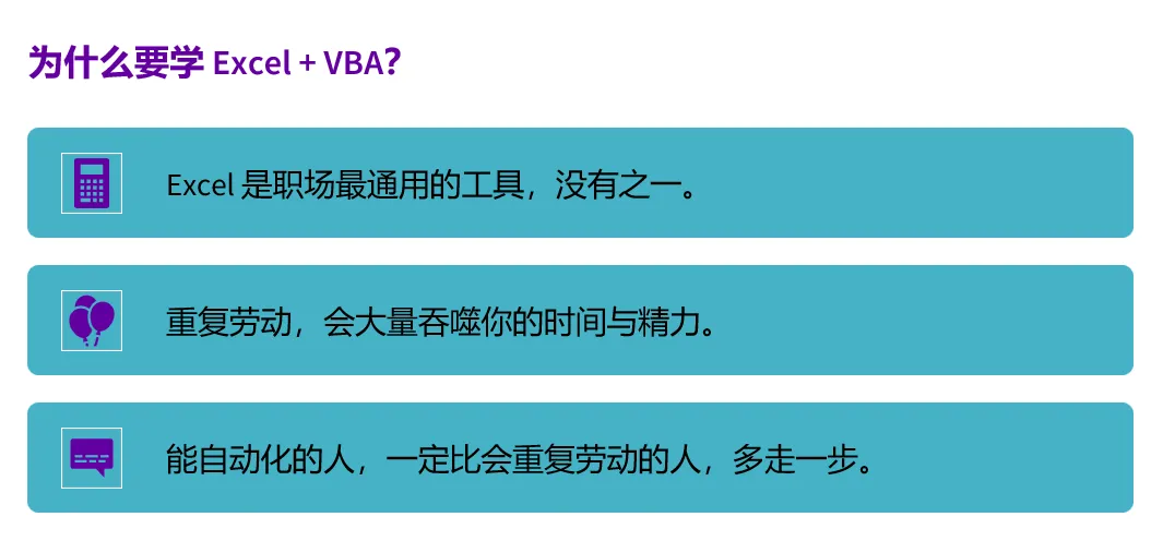 ②.重复劳动会大量吞噬你的时间与精力。而 VBA 是 Excel 的“外挂”和“大脑”,能够让 Excel 自动化运行。