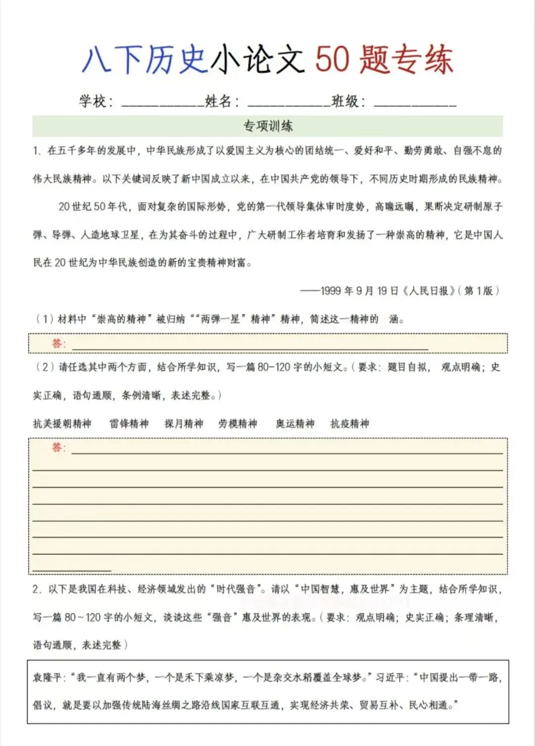 八年级下历史期末历史小论文题专练50题/电子版可打印 以下为部分截图,具体看完整PDF文件 (温馨提示:文末有电子版领取方式) 领取完整电子版: ①:点一点右下角的“赞”和“在看”,感谢支持! ②:点击“关注”,回复资料领取