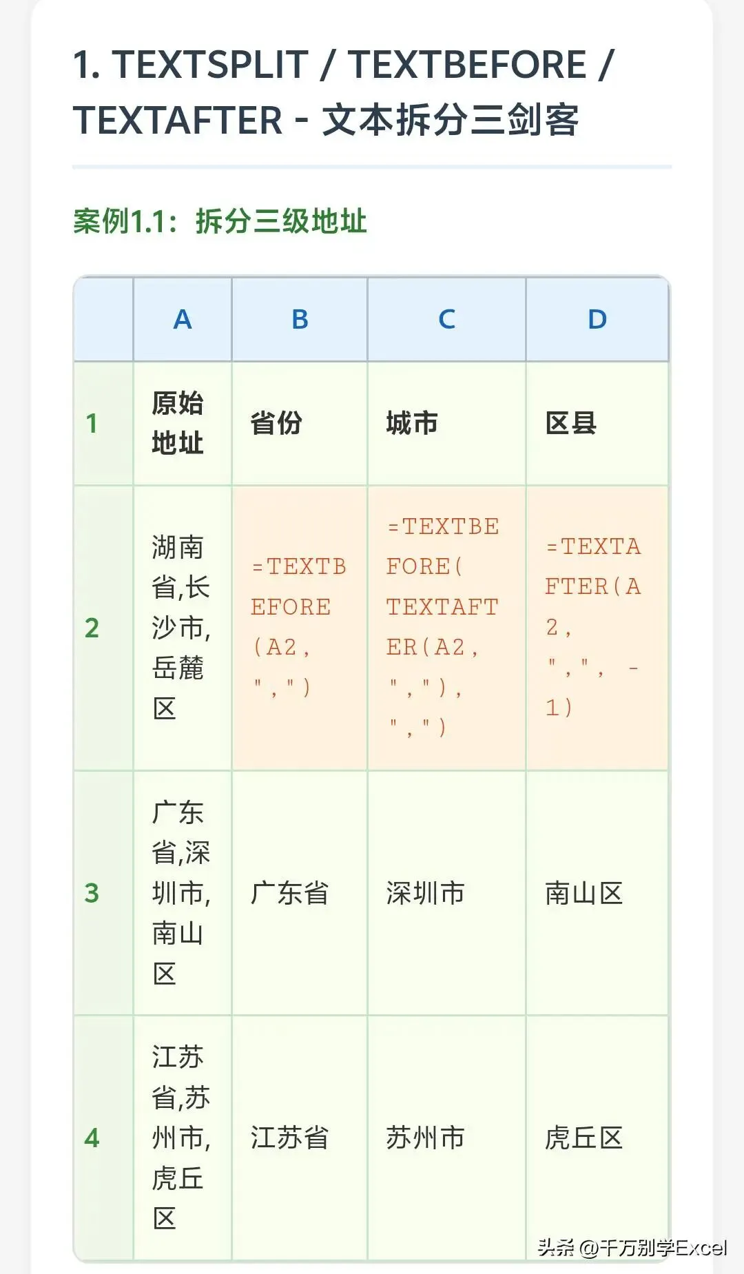 :可按行、列两个维度将文本拆成动态数组,替代“分列”且结果自动溢出。 干货升级:处理跨行地址。若单元格内文本由换行符分隔,可使用 =TEXTSPLIT(A2, , CHAR(10)),第二个参数留空,第三个参数用CHAR(10)表示换行符。 - TEXTBEFORE(文本, 分隔符)