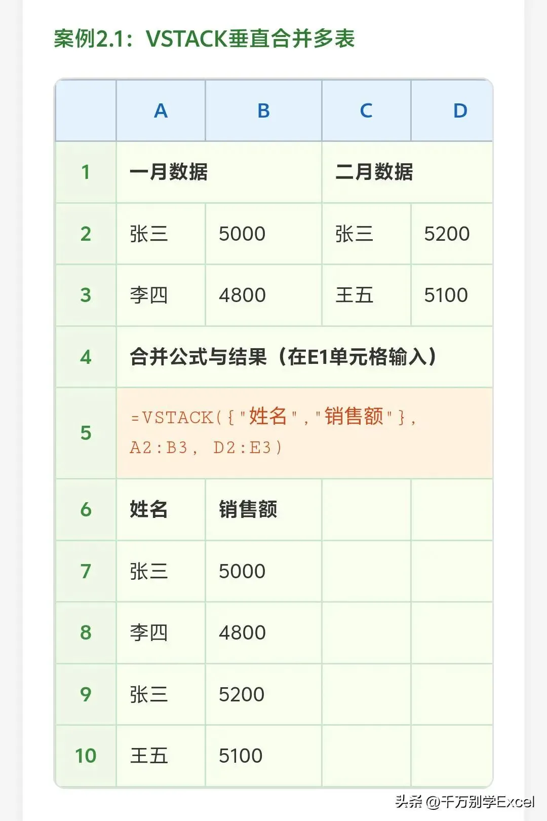:垂直堆叠多个数组。用于合并结构相同的月度表、部门表。 高阶应用:快速创建动态查询表。=VLOOKUP(“目标”, VSTACK(表1, 表2, 表3), 列序, 0),一键实现多表合并查询。 - HSTACK(数组1, 数组2,…)