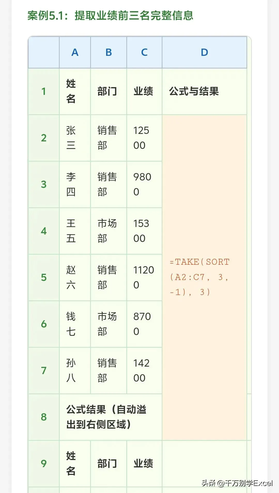这才是“降维打击”的完全体。例如,从销售表中找出销售部业绩前3名的姓名和销售额: