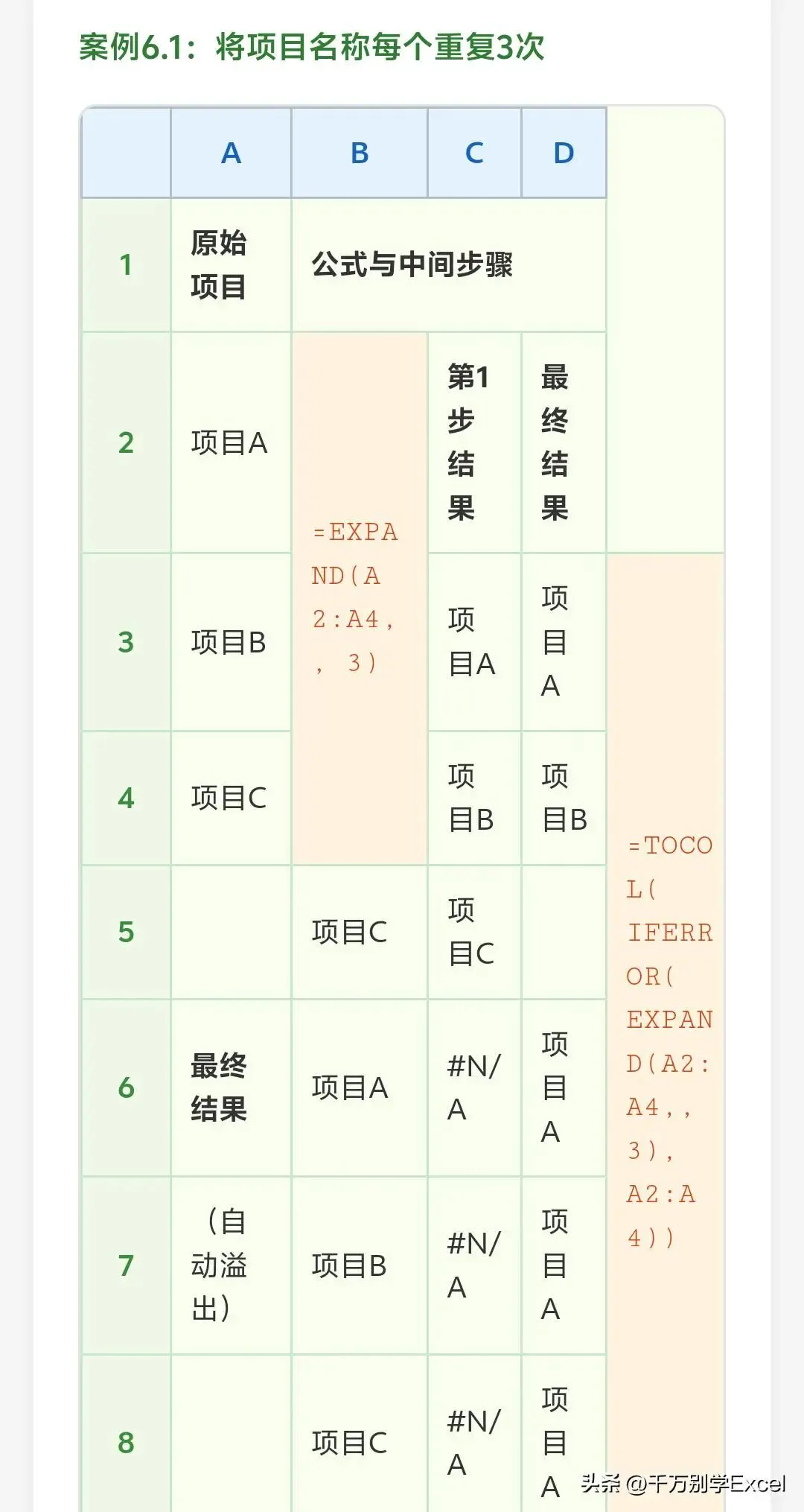 :生成重复序列。若A2:A4为{“春”,“夏”,“秋”},要生成{“春”,“春”,“夏”,“夏”,“秋”,“秋”}。 =TOCOL(IF(SEQUENCE(,2), A2:A4)) 或 =TOCOL(EXPAND(A2:A4, , 2, A2:A4)) EXPAND将一列扩展为两列,并用自身填充空白,TOCOL再拉直。