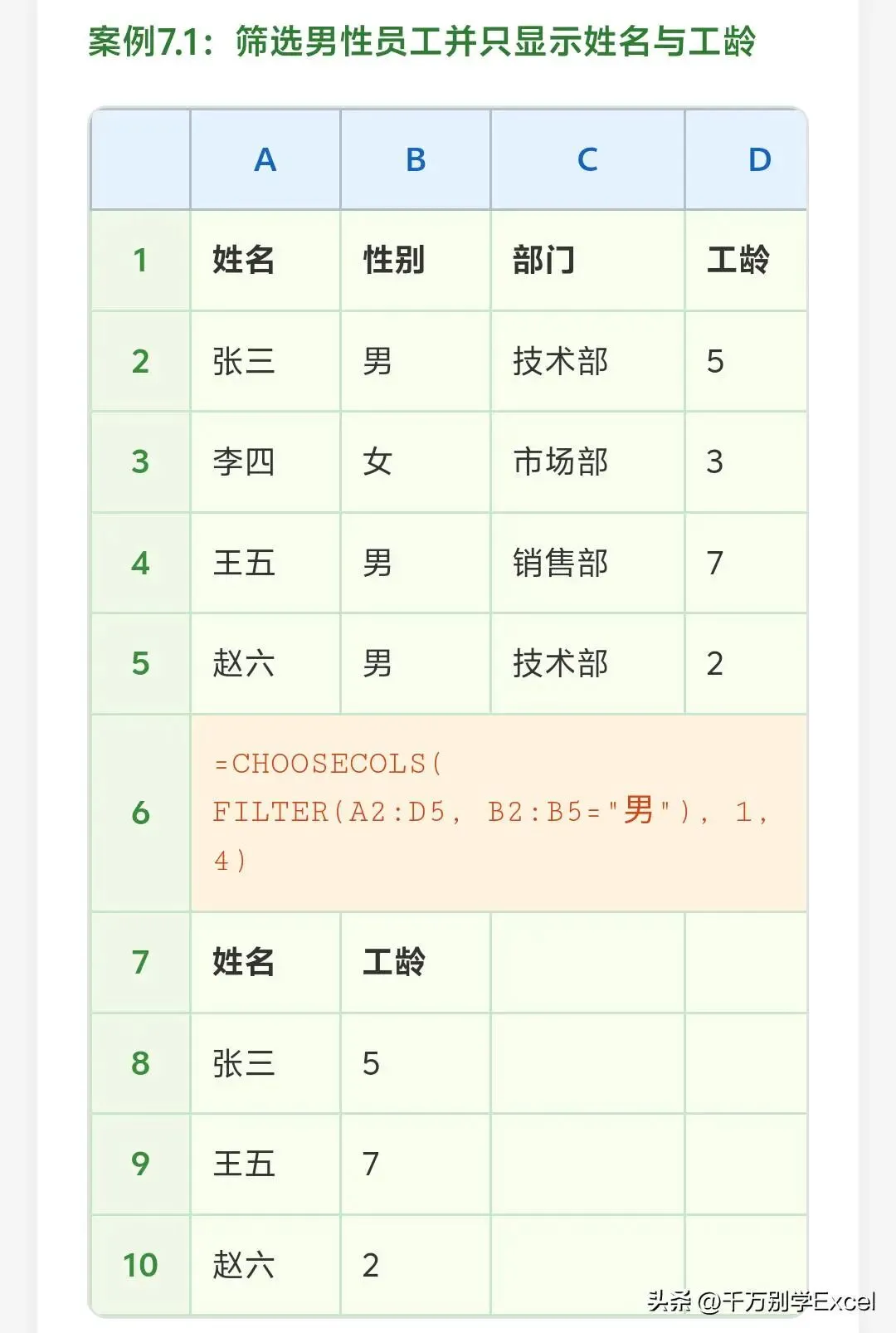 :从筛选结果中只保留指定列,告别隐藏列。 实战:=CHOOSECOLS(FILTER(全员表, 部门=“销售”), 2, 4, 5),筛选销售部,并只显示姓名、电话、邮箱三列。 - CHOOSEROWS(数组, 行索引1, 行索引2…)