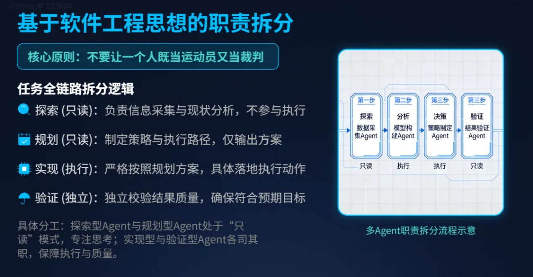 这种设计有效地解决了单一模型既当“运动员”又当“裁判员”的幻觉问题。避免了模型在执行过程中由于赶进度而产生的“差不多就行”的心理归因,确保每一步决策都有据可循。