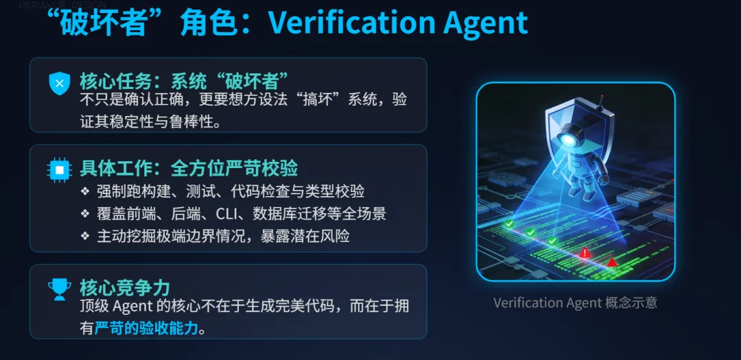 系统内置的 Verification Agent 并不温柔,它的任务是“搞坏系统”。它会强制执行构建流程、跑单元测试、进行类型校验,并覆盖从 CLI 到数据库迁移的所有场景。它甚至会主动推演边界条件,直到确认代码在工业环境下依然稳固。顶级 Agent 的竞争力不在于能写 80 分的代码,而在于它具备严苛的自反馈闭环。