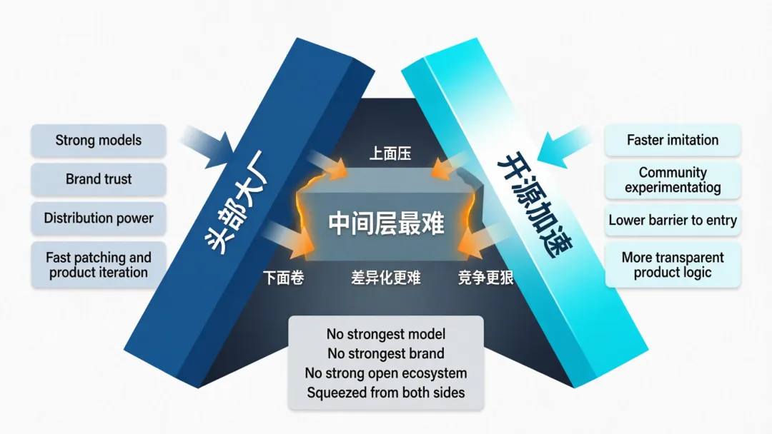 因为头部厂商即便翻一次车,仍然有品牌、模型、资源、分发和用户基盘托着;开源社区则会因为这种事情迎来一次“集体提速”;最尴尬的,是夹在中间的那些产品。