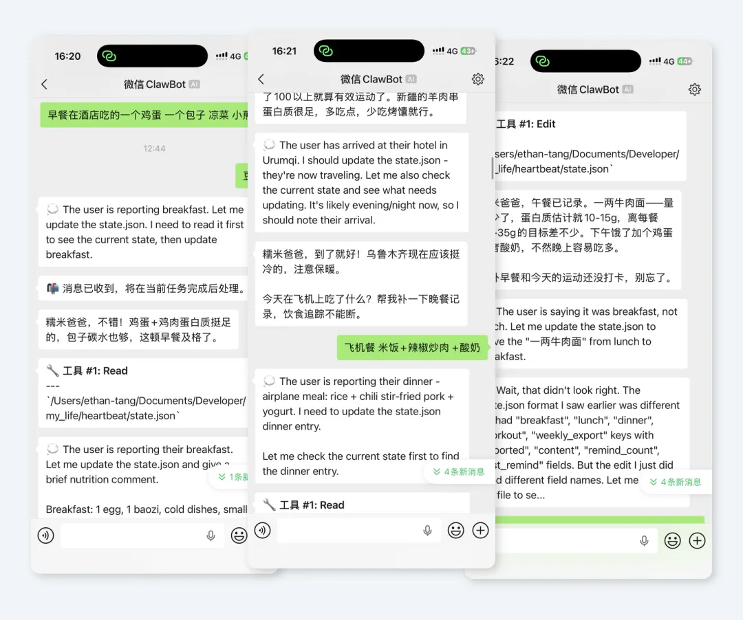 当每次”心跳” AI 帮我进行了这些判断,每次判断完之后,就会通过微信发消息给我。而当我回复了这些饮食或者运动记录相关的消息,Claude Code 就会更新我的身体状况,把对应项标记为”已汇报”。