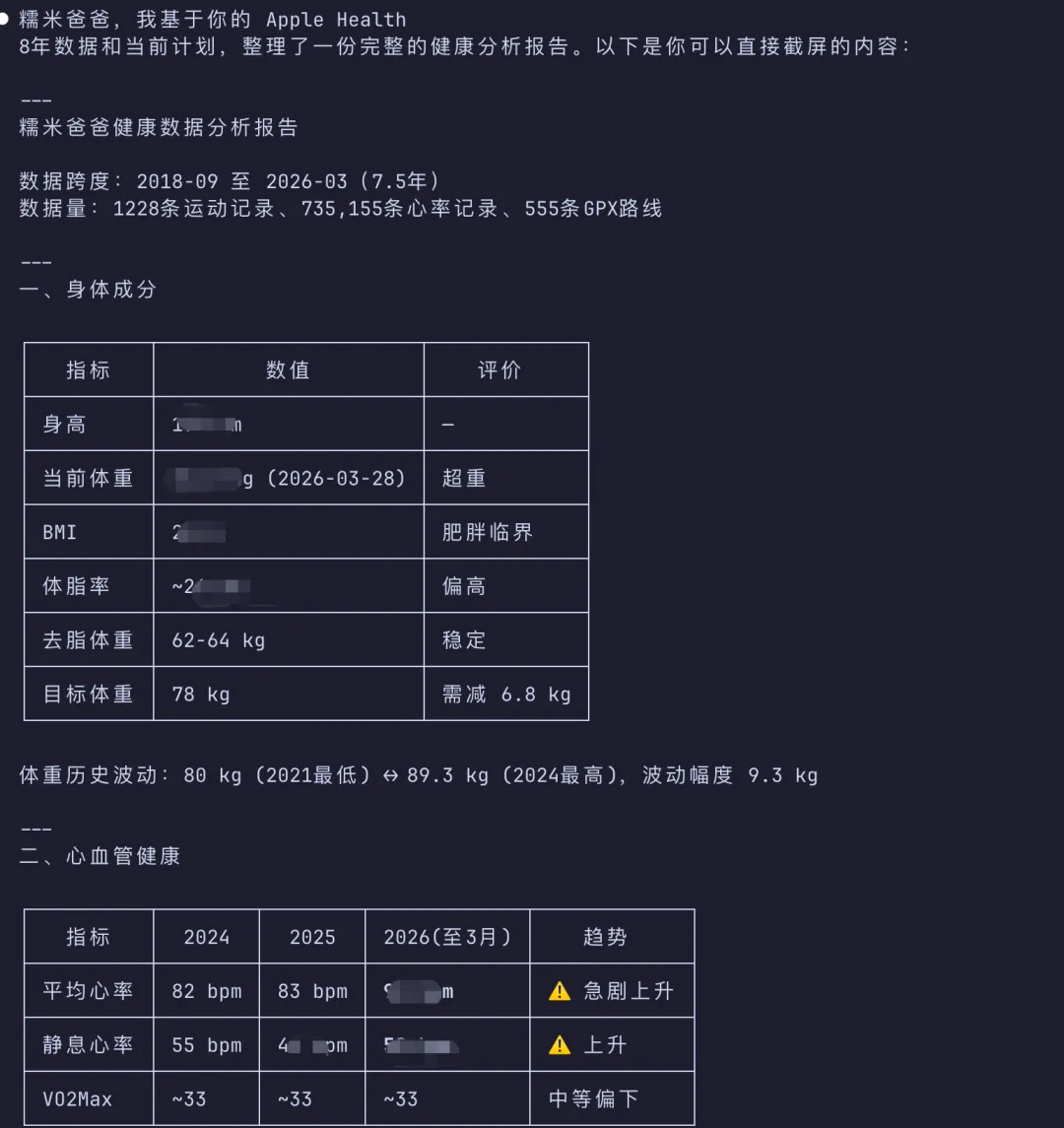 我戴了 8 年的 Apple Watch,苹果手机的”健康”程序里存了 1228 条训练记录和 73 万条心率数据。我觉得这些数据挺有用,直到有一天,我发现自己从来没有认真分析过它们。于是我干了一件事情:把 Apple 健康的数据导出来,让 Claude Code 帮我分析。