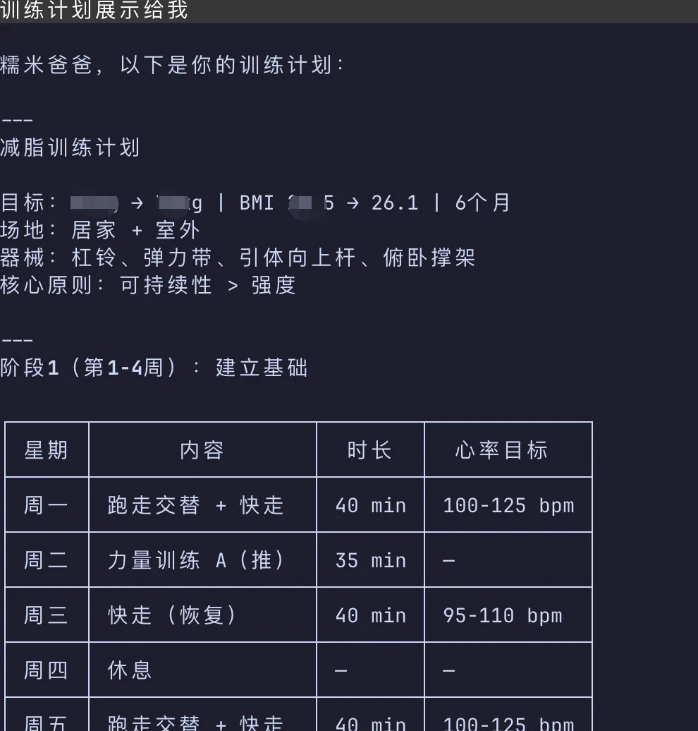 第三步,让它帮你做教练。 告诉Claude Code你的目标、你有什么器械、你的作息习惯。让它帮你生成训练计划、接入你的聊天工具。