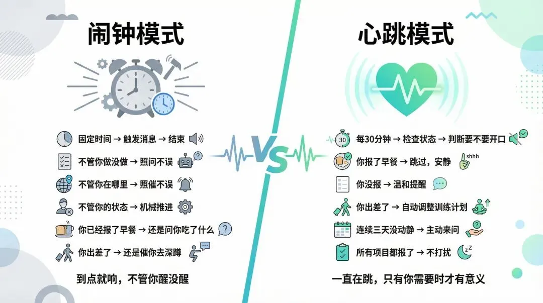 OpenClaw 很火——它让 AI 通过 WhatsApp、Telegram 当你的私人教练,核心是一个”心跳机制”:AI 持续在线,定期检查你的状态。