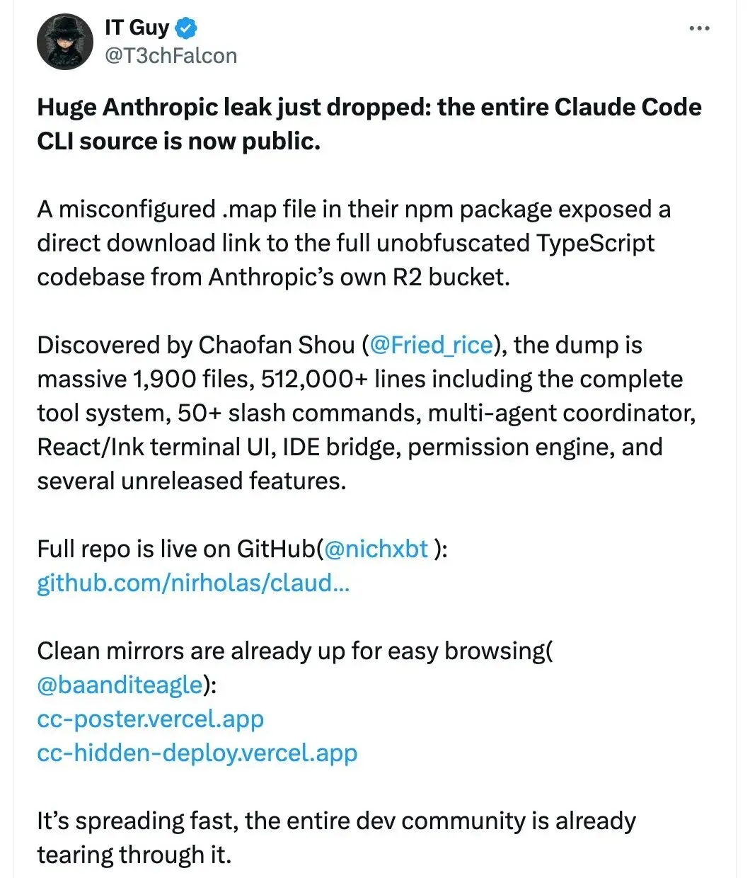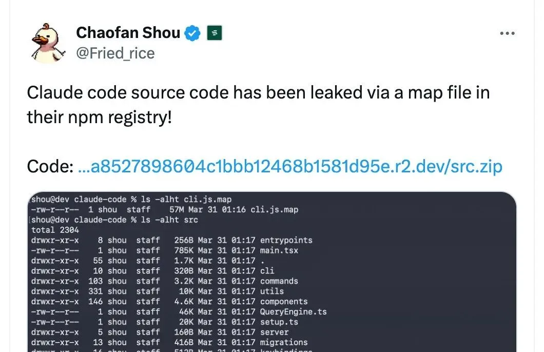 2026 年 3 月 31 日,安全研究员 Chaofan Shou 在 X 上发布了一条震动整个开发者社区的帖子:Anthropic 旗下的 AI 编程工具 Claude Code,其完整源代码通过 npm 包中的 source map 文件意外泄露。这条推文迅速获得千万次浏览,成为当日技术圈最大的新闻。